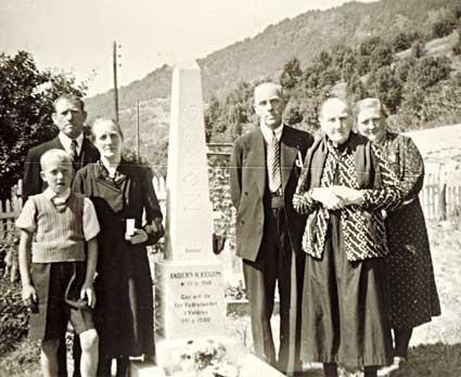 Krans på grava i 1946. Frå venstre: Hans Eggum, Kåre Eggum. Marie Eggum, Nils L. Husabø, Kari Kvalen og Stina Husabø. Bokstavane i NOREG skrive vertikalt er endå ikkje måla. Det høyrde opphavleg ein ca. 15 cm høg karm til minnesmerket som var "fylt" av det norske flagget i naturfarga steinmosaikk. Karmen vart ein gong fjerna og flagget plassert i bakkehøgd i samband med at ein tok bort alle gravkarmane for å gjera slåtten enklare.