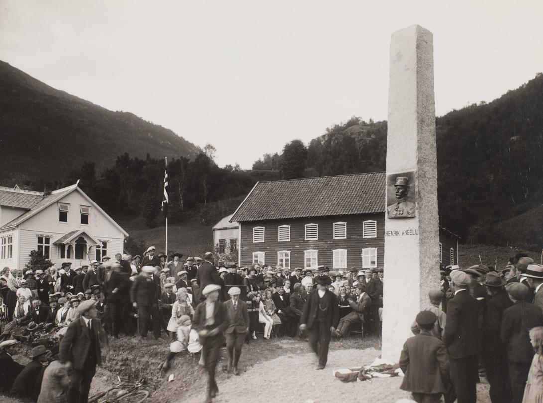 Oberst Henrik August Angell døydde 26.1.1922. Året etter tok Sogns Ungdomslag opp spørsmålet om å reisa ein minnestein på fødestaden hans. I eit opprop i fleire aviser vart alle ungdomslaga i Sogn særleg oppmoda om å støtta arbeidet. Responsen var god. Den 22. august 1924 var alt klart for avdukingshøgtid. Kring 1200 menneske møtte fram. Lærar Jens Kvåle heldt avdukingstalen. Formannen i Sogns Ungdomslag, Sigurd Fjøsne, overleverte steinen til Luster kommune, og ordførar Jens Døsen takka og lova å ta vare på minnesmerket på det beste. Sonen Atle Angell takka frå familien for den æra som her vart synt far hans.