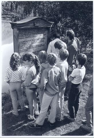 Frå avdukinga i august 1984. Elevar frå Bolstad skule ser på minnesmerket og universitetslektor Lars Steinar Hauge fortel og forklarar.