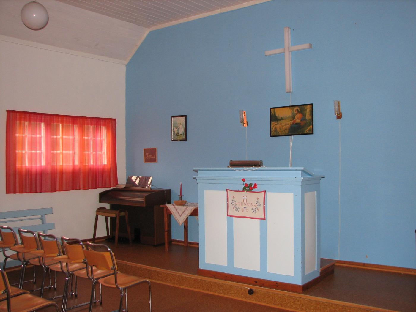 Talarstolen er fast montert på eit lågt podium. Veggen bak talarstolen er utsmykka med ein kvit kross, bilete med motiv frå bibelen og Jesus-broderi. Bedehuset har elektronisk orgel. Eit spesielt inventarstykke er ei handlaga utlodningskinne med nummerlappar frå 1 - om lag 1000 oppi. Det var enten lærar Harald Slinde eller Torstein Fardal som laga kinna, truleg før bedehuset kom opp. Dei heldt basarar på skulehusa på Nygard og i Øyragrendi i mange år føre bedehuset stod ferdig.