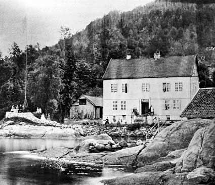 Bilete av hovudhuset i Flesje. Til venstre kring flaggstonga heitte det Skansen. Der stod det bord og stolar og dette var ein fin plass når det var godvêr og utsynet over Sognefjorden var vidt og fagert. Til høgre ser me taket på sjøbua. Ho datt ned i 1960-åra.