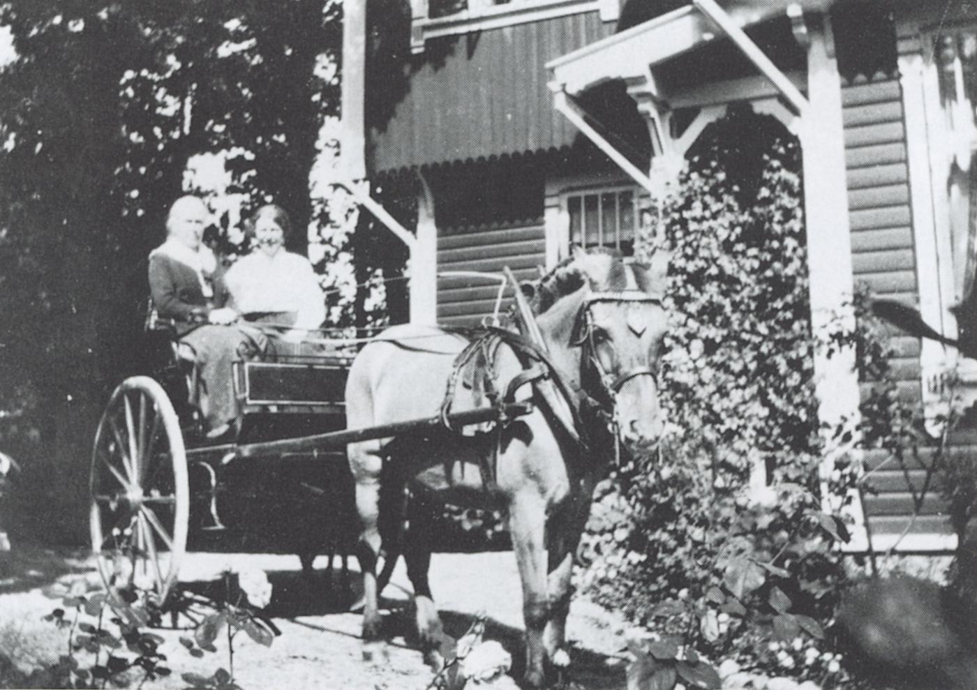 Miss Abbott (t.v.) og Margit Sahlgaard Børresen framføre villaen som miss Abbott bygde. Desse to damene med hest og kjerre var eit vanlege syn for bygdefolket.