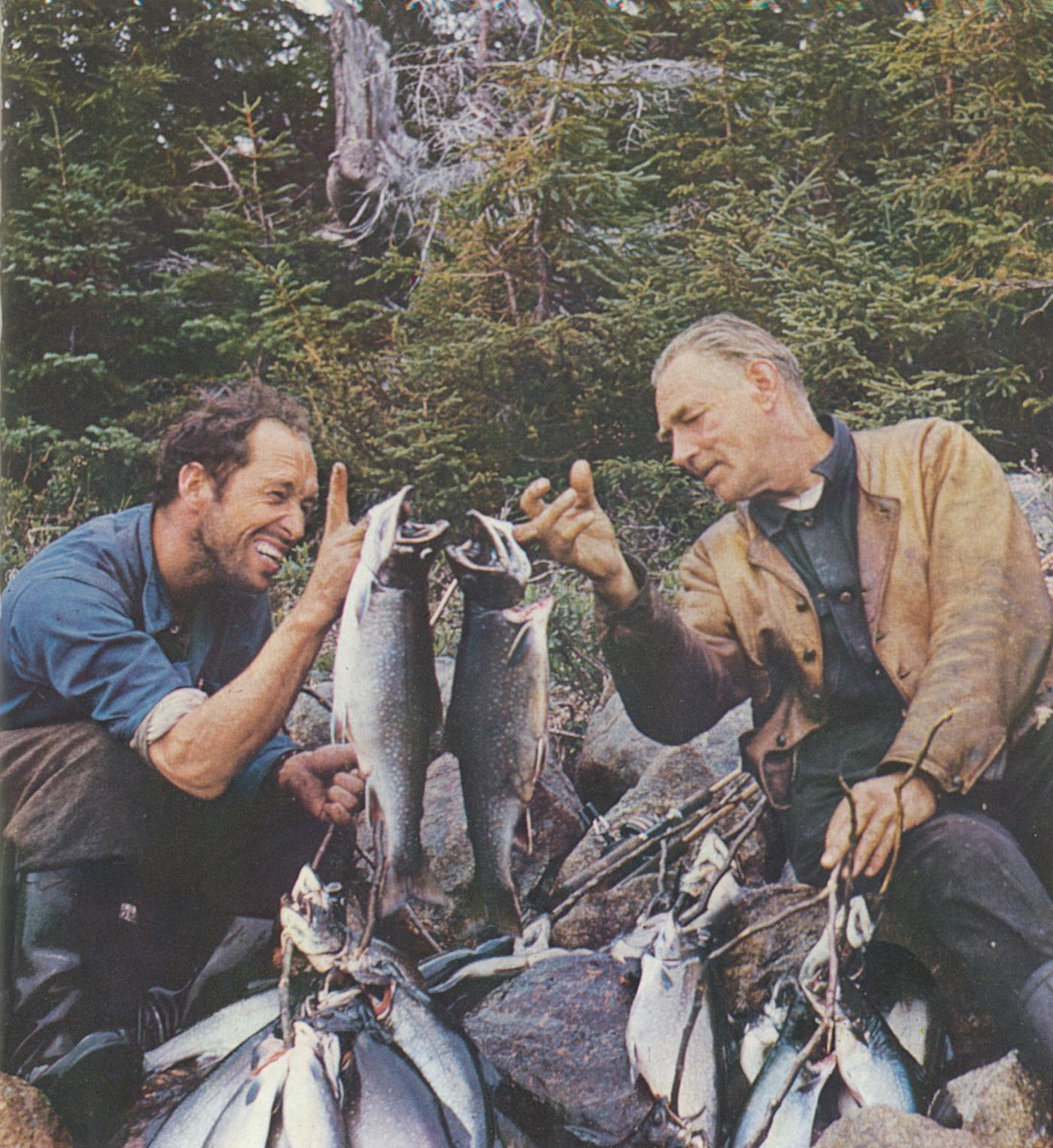 Dr. Odd Martens accompanied Helge Ingstad to "Vinland". In the photo Martens can be seen to the right, together with Erling Brunborg. They have been angling for trout in Hawke's Bay in Labrador. Who caught the largest trout?