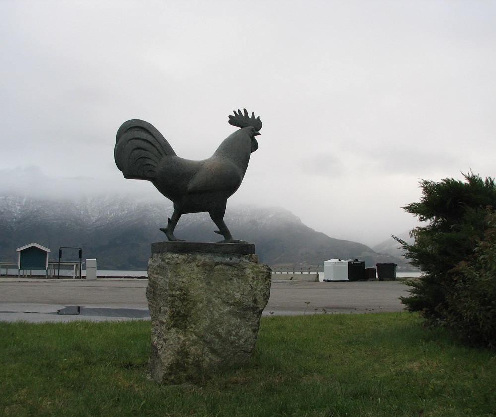 "Det var 17. mai-stemning på Hanahaug i går ettermiddag, då skulpturen av hanen vart avduka. Overraskande mykje folk hadde funne vegen, og feiande tonar frå Leikanger skulemusikk gjorde sitt til å skapa høgtid og fest.