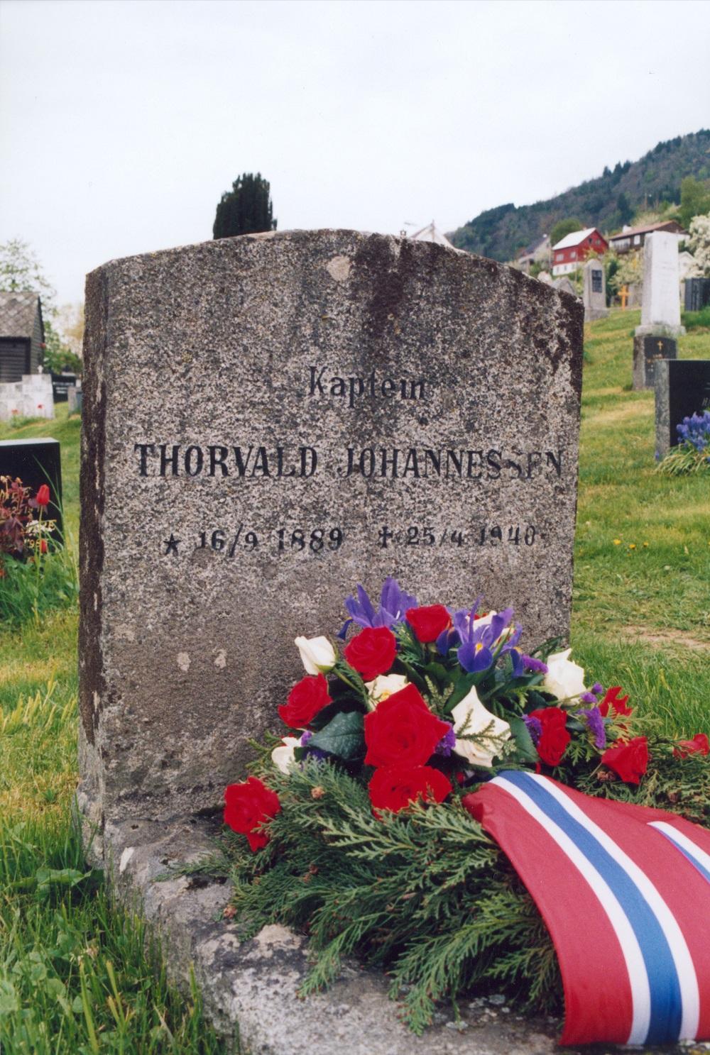 "JOHANNESSEN, THORVALD KORNELIUS, skipsfører, Åsane. Født 16. september 1889 i Bergen, s. av Hans Johannessen, f. 1842, og Kari f. Flekke, f. 1847 i Fjaler. Gift 1915 i Bergen med Valborg Andersen, f. 1889 s. st. 1 barn. Styrmanns- og skipperskole. Var skipsfører på d/s Kommandøren som etter krigsutbruddet i Norge 1940 gikk i troppetransport i Sognefjorden. Da skipet lå ved Leikanger, ble det angrepet av tyske bombefly, han ble såret av en granatsplint og kjørt til Lærdal sykehus hvor han døde 25. april 1940. Gravlagt s. st."