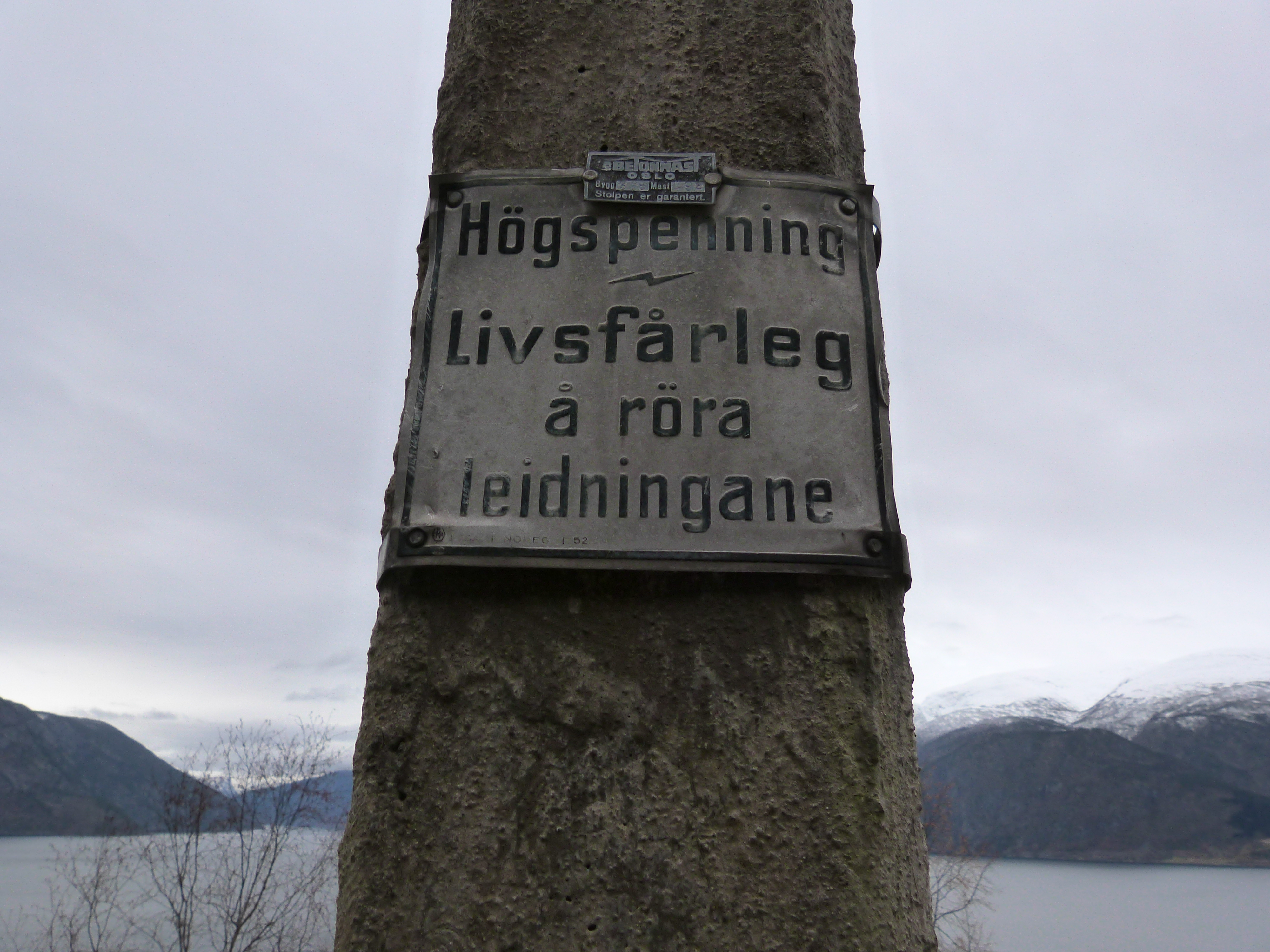 På masta er festa eit nyare varselmerke i metall, og det er spor av feste etter eit eldre. Det eldre skiltet var nok det same som framleis finst på neste masta vestover, Der står: