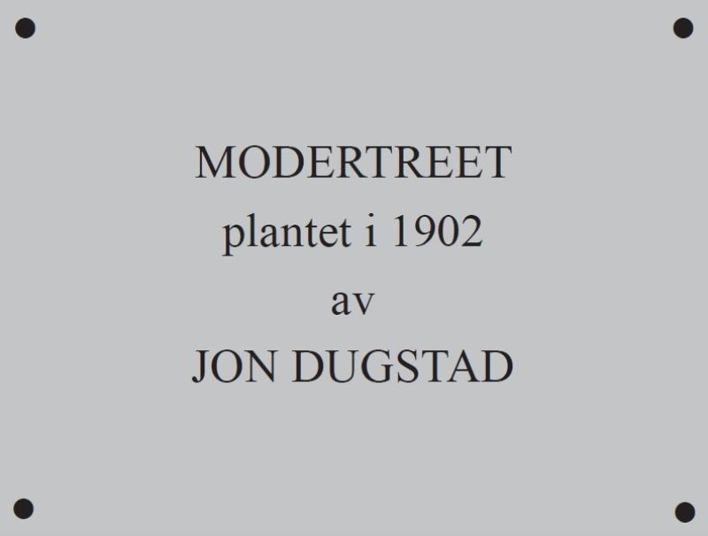 «Modertreet plantet i 1902 av Jon Dugstad»