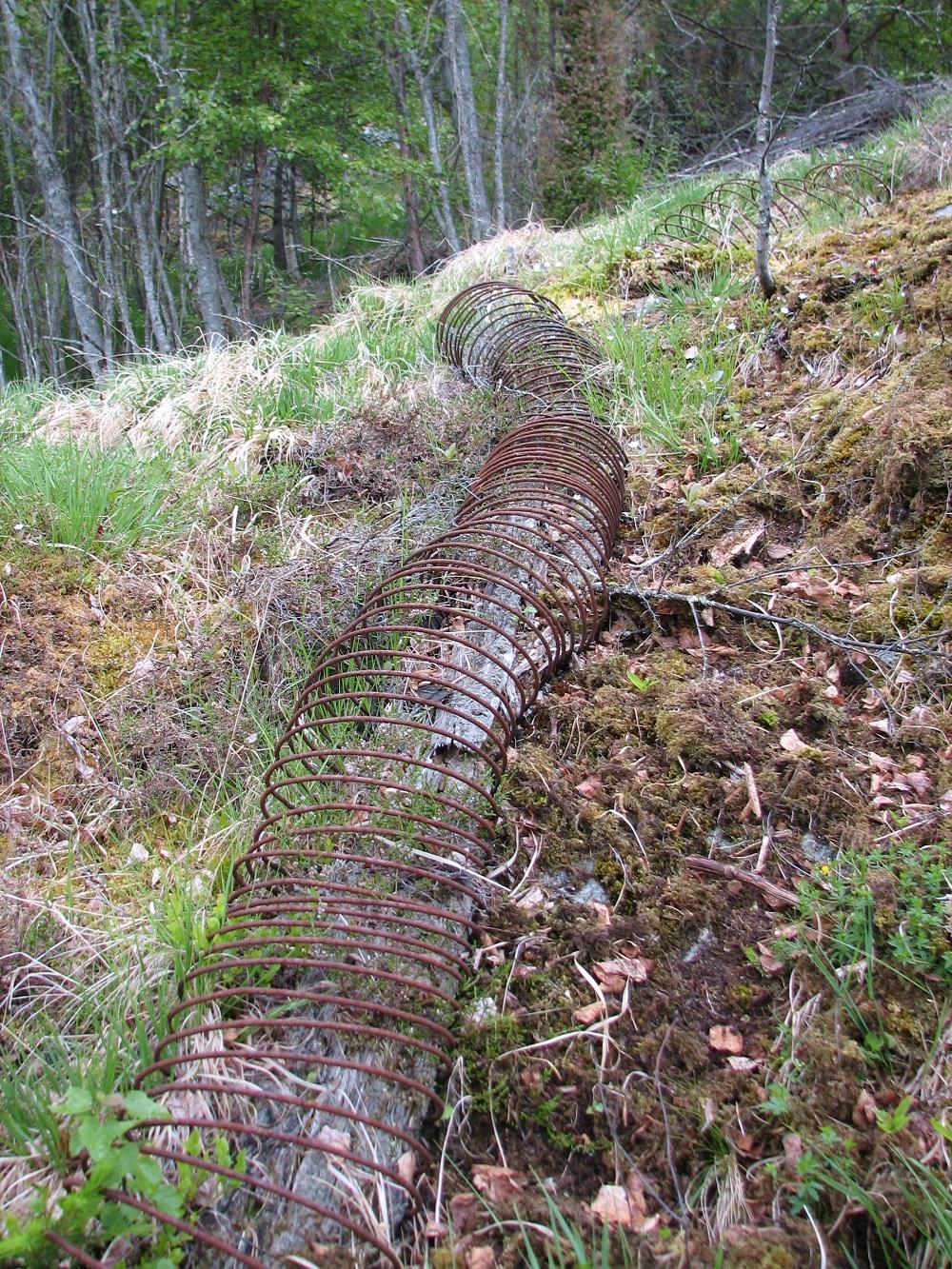 I bakken nett ovanom saga ligg det noko merkeleg, - ein rusta jernspiral oppover så langt auga rekk, ser ut som ein kjempstor orm. Inni spiralen ligg halvt opprotna trevyrke. Kva i all verda er dette for noko? Den som kjenner til at dei før i tida brukte trerøyr omvunne med tjukk jerntråd, vil koma på svaret. Det må vera restane av ei røyrgate. Det melder seg straks fleire spørsmål: Kvifor var det i si tid ei røyrgate her? Kvar kom vatnet frå? Kva tid vart røyrgata bygd? Kor lenge var ho i bruk?