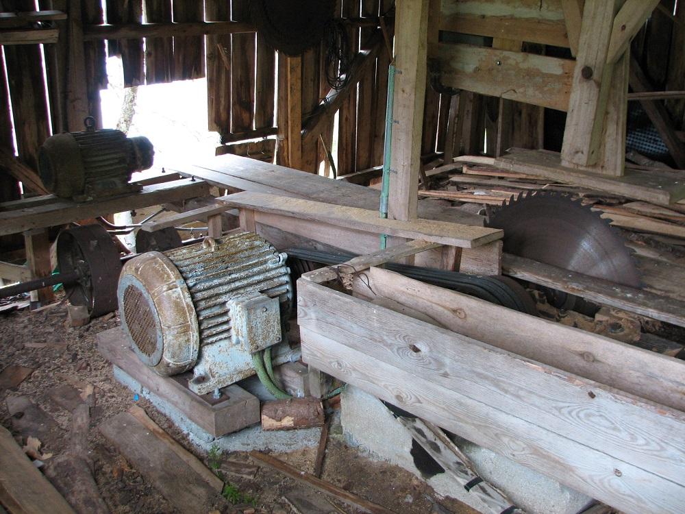 - tenkjer me, på veg nedatt, for å finna ut meir om den andre enden på røyrgata. Det er tre opningar i den eine langveggen på saga. Me ser sagbenk, sagblad, hjul og reimar, og ein stor, elektrisk motor. Det er ei elektrisk driven sag dette. Ja vel, men kva med tida før det kom straum til Rud (1952) og dei andre gardane her omkring? Mon tru om ikkje saga er av eldre dato enn elektrisiteten, og at saga då var driven med vasskraft frå oppdemninga oppe i skogkanten?