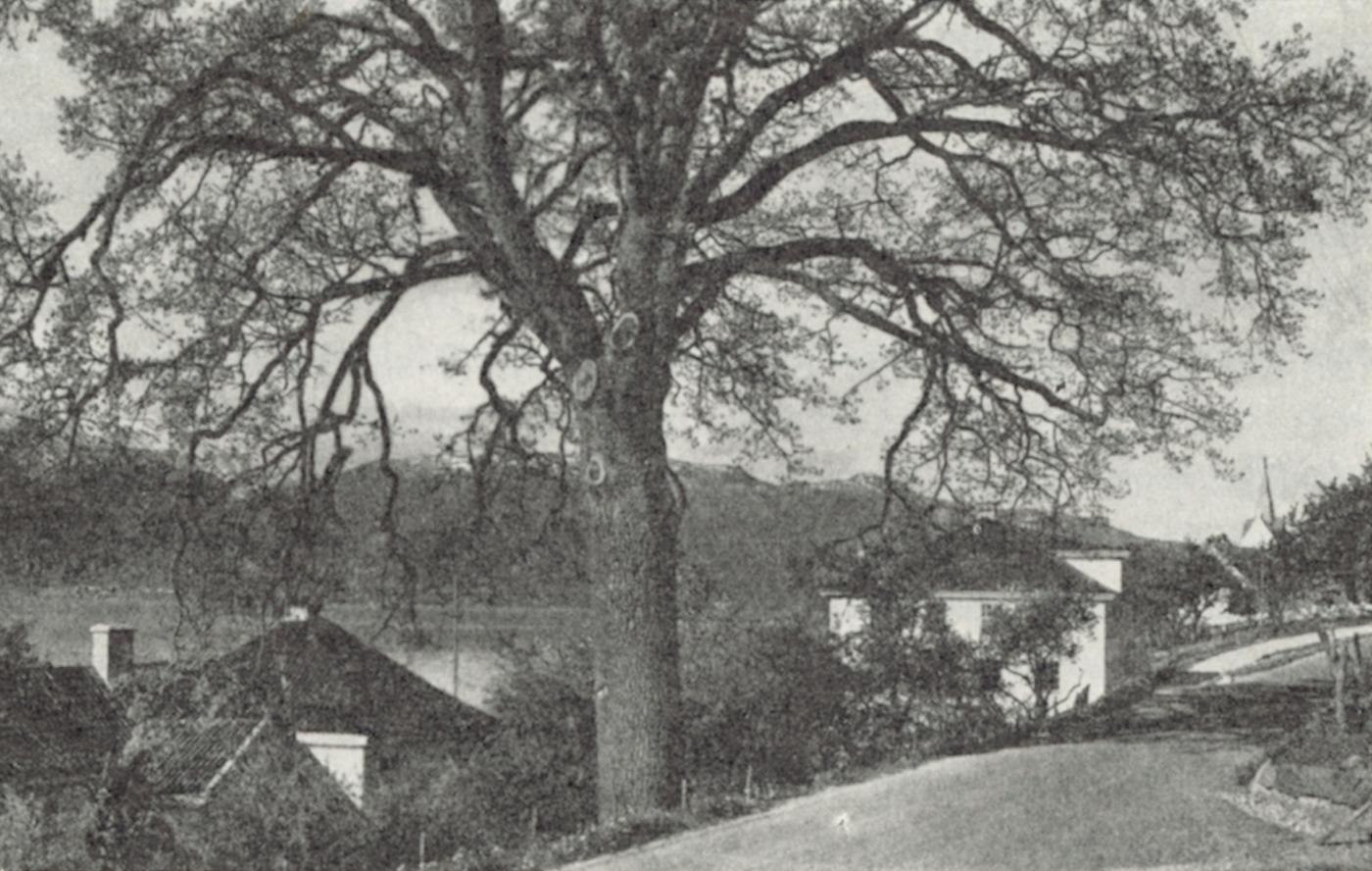 Skrivareiki kring 1950. Treet har vore nemnd med to andre namn tidlegare, Hallandseiki etter garden ho står på, og Futeeiki. Til høgre Tinghus I, bygd i 1937.