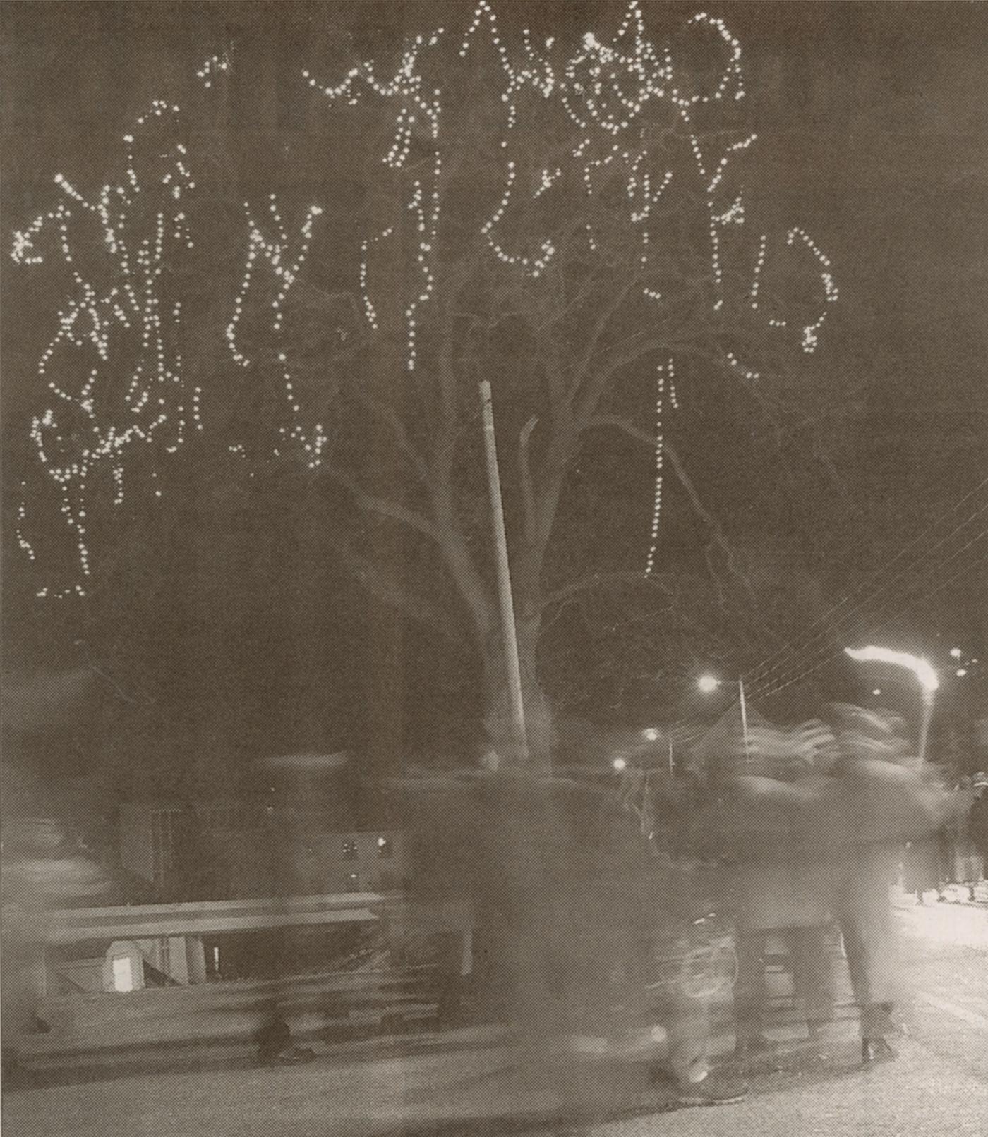 Skrivareiki med 2000 lys mot natthimmelen nyårskvelden ved tusenårsskiftet. Det var Tusenårskomiteen under leiing av Kjerstin Risnes som hadde kome på å lyssetje den eldgamle eika ved dette høvet og samla systrendingane her ved inngangen til det nye tusenåret.