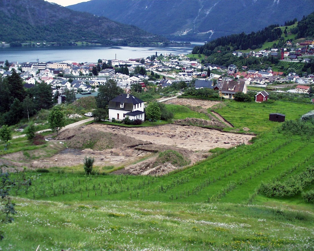 På den sørlege delen av Rutlin-terrassen låg ein bygning frå høgmellomalderen (1200 e. Kr.), 32 x 6,5 m stor. Ut frå funn av keramikk, veit ein at den var i bruk på midten av 1100-talet. Denne bygningen er stolpesett. Her er to rekkjer med takberande stolpar som er trekte ut i ytterveggen. Tre stolpar inne i bygningen har berre hatt støttande funksjon. Det er få kjende stolpesette bygningar frå mellomalderen, og arkeologar har difor meint at laft var den vanlege bygningsmetoden.