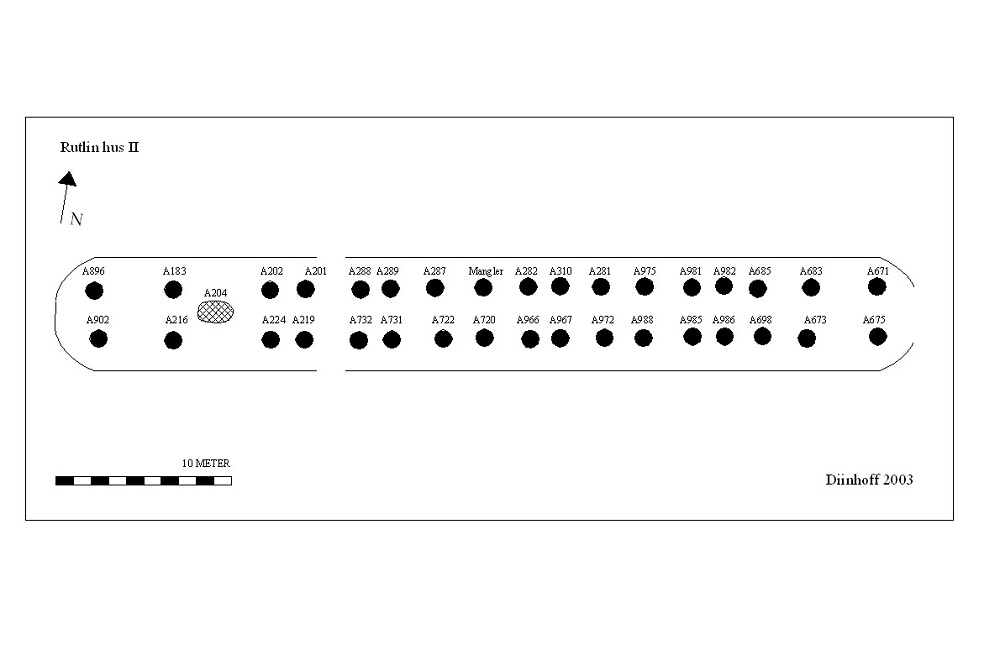 I dei siste århundra før Kristus stod eit treskipa langhus på om lag 6,5 x 18/19 m på Rutlin. Den neste bygningen som er identifisert, var i bruk i den midtre delen av jarnalderen (om lag 300-500 e. Kr.). Denne var mellom 14 og 16 m lang, og har husa både menneske og dyr. Frå sein romersk jarnalder/folkevandringstid (om lag 350 e.Kr) er det dokumentert eit stort langhus. Det var orientert aust-vest på flata og var om lag 50 m langt og 6,5 m breitt. Denne bygningen hadde djupe steinskodde stolpehol med diameter på over 40 cm. Stolpane i store bygningar vart ofte skodde med steinar for at dei skulle stå betre. Funn av leirklining viser at veggene har hatt leirklint flettverk. Bjørkenever tyder at taket har vore torvlagt. I denne bygningen vart det gjort funn av potteskår, vevlodd, bryne og jernknivar.
