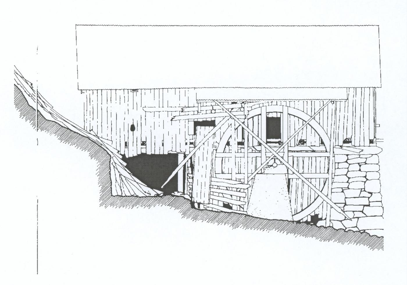 The saw mill was accurately measured in 1985. At the front the building rests on two solid stone foundations made up of rocks that had to be blasted to get a big enough site for the saw mill.