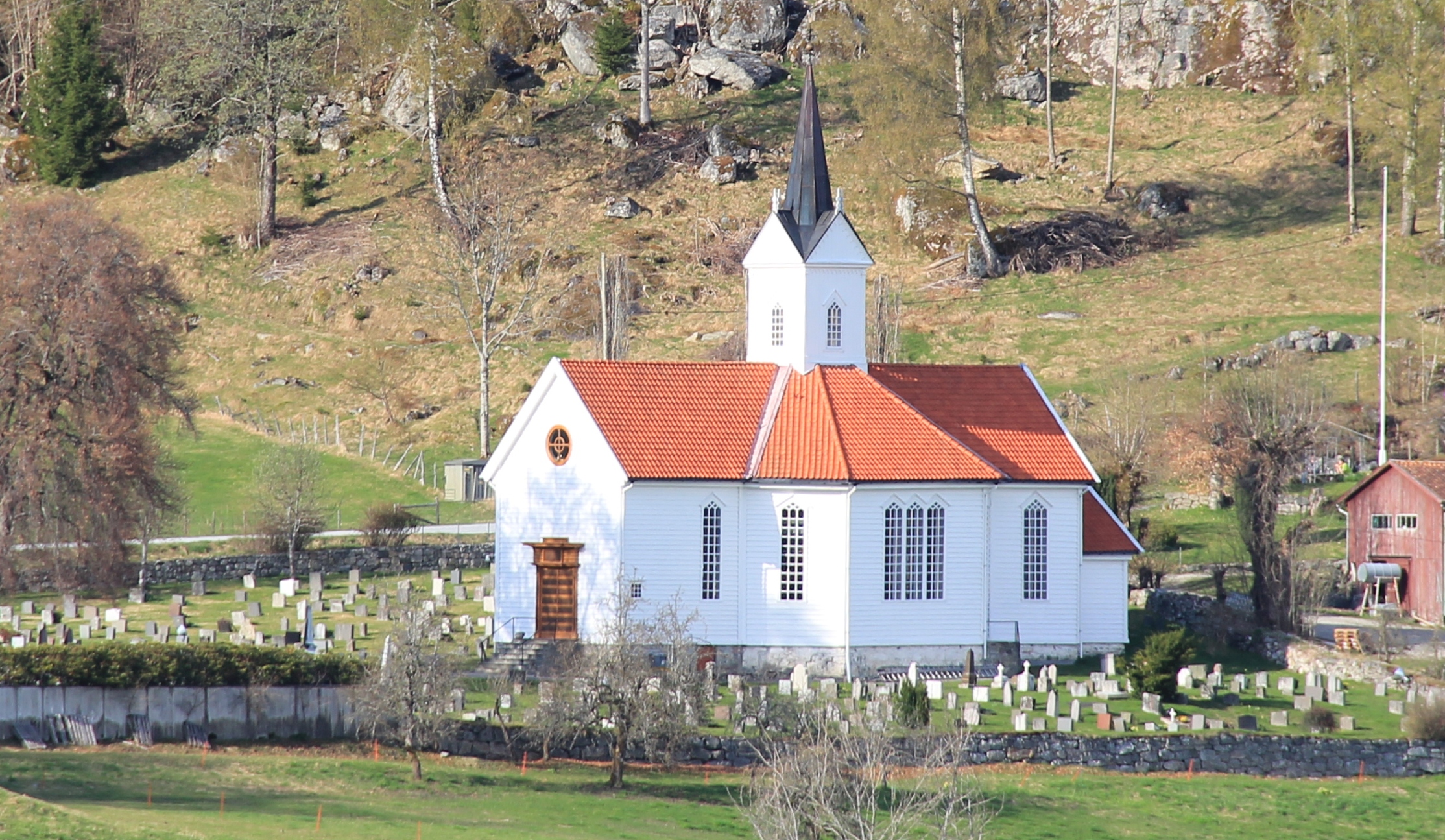 Då kyrkja vart bygd i 1863 var det naturleg at kyrkjestaden framleis skulle liggje mest mogleg midt i soknet. På Tjugum var det også både bank og vertshus, og denne sida av Esefjorden var meir sentral enn Holmen. Men noko seinare kom dampskipsekspedisjonen på Holmen, og Kvikne's hotell frå 1885. I dag er såleis plasseringa tungvint, og vinterstid er kyrkjevegen til tider direkte farleg. Folk som bur i sentrum må køyre rundt den rasfarlege Esebotnen. Kyrkjesøkinga derifrå har difor mange gonger vore dårleg på grunn av faren for ras.