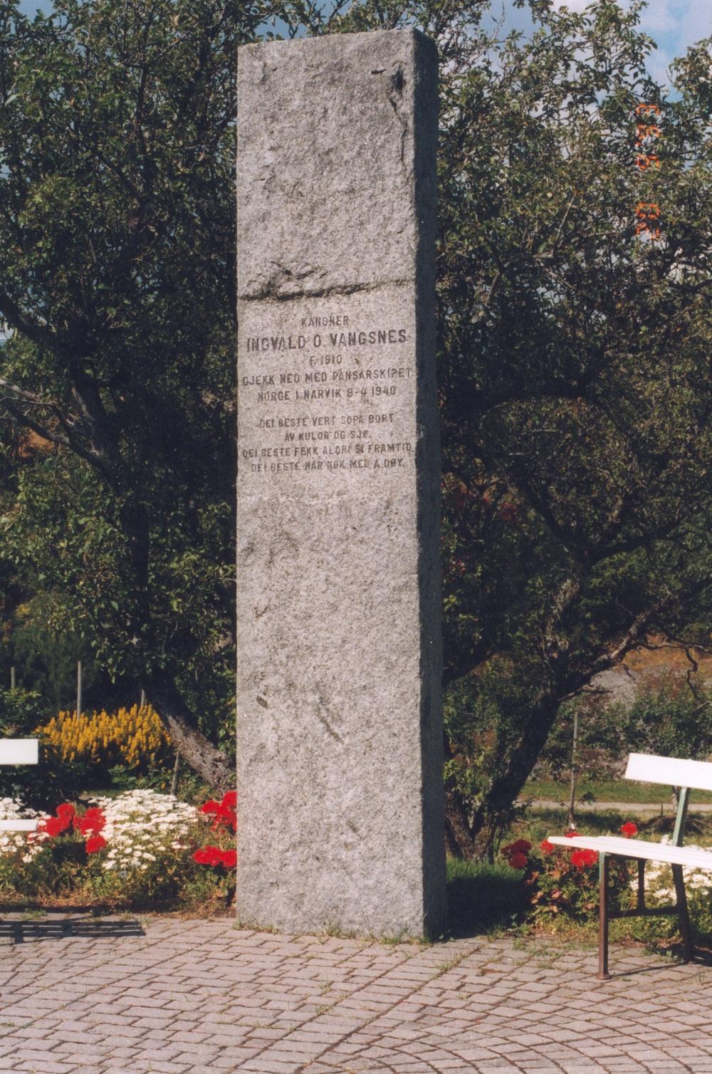 Minnesteinen over Ingvald Vangsnes står eit kort stykke opp frå ferjekaia på Vangsnes. Det er laga til med brustein og planta blomar, og om sommaren vert det sett ut benker. Steinen er av granitt, 4 m høg, og hoggen av Vestlandske Granitt ved Adolf Hansen. På framsida står: KANONER * INGVALD O. VANGSNES * F.1910 * GJEKK NED MED PANSERSKIPET * NORGE I NARVIK 9 - 4 - 1940 * DET BESTE VERT SOPA BORT * AV KULOR OG SJØ. * DEI BESTE FEKK ALDRI SI FRAMTID * DEI BESTE HAR NOK MED Å DØY.