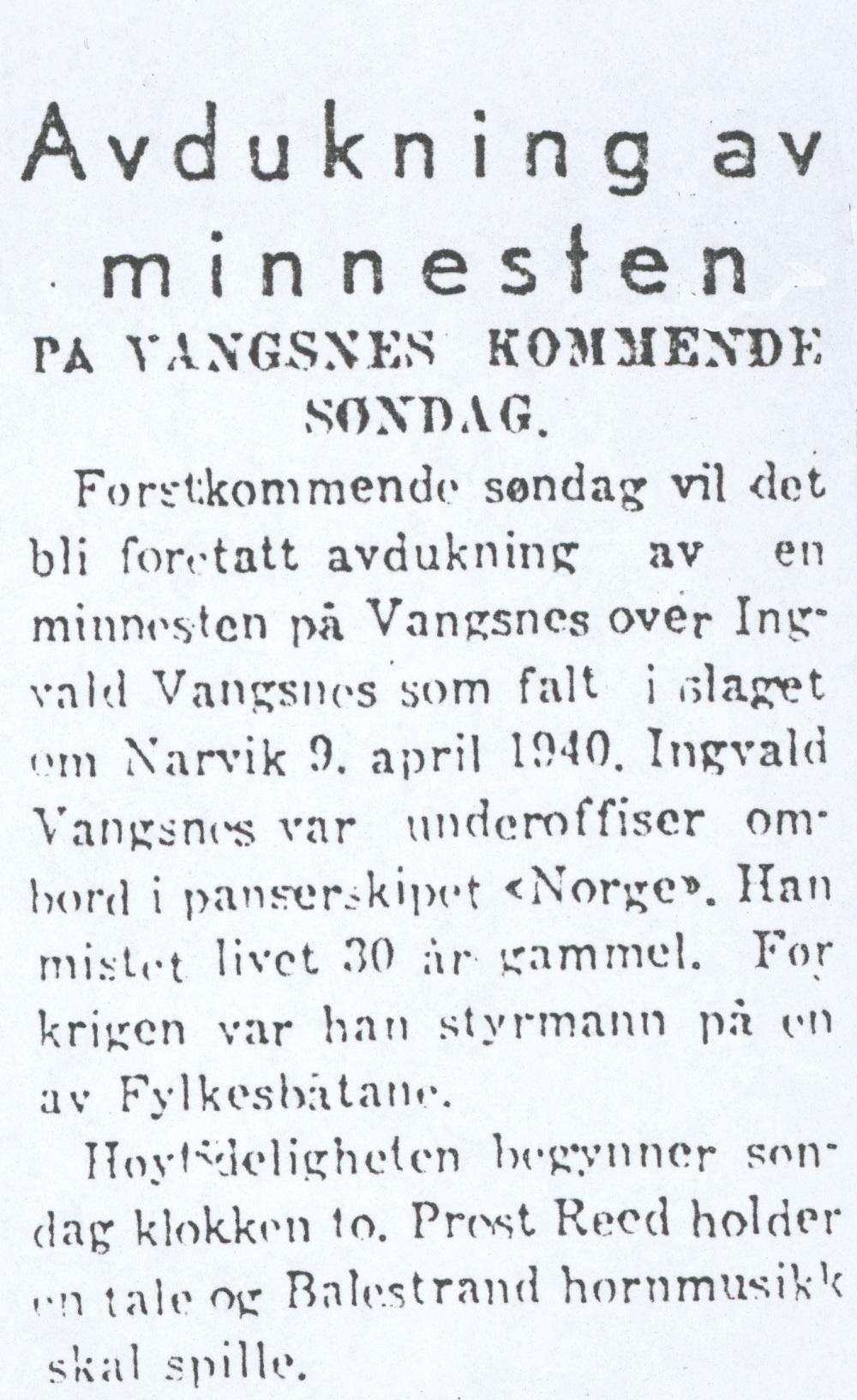 "Før møtet tok til med å handsama saklista tok ordføraren ordet, og i varme og indarlege ord heidra han minnet åt dei tvo mennene frå heradet, nemleg styrmann Ingvald Olsson Vangsnes og matros Georg Endreson Distad, som fall i krigen i Norge våren 1940. Ordføraren bar fram ei djupfølt takk til dei både for at dei sette inn og gav det kjæraste eit menneskje eig, livet. Møtelyden høyrde på minnetalen ståande.