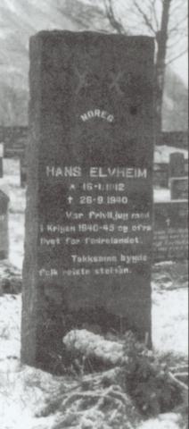 NOREG (i boge) * HANS ELVHEIM * 16-1.1912 * 26-9.1940 * Var friviljug med * i Krigen 1940-1945 og ofra * livet for fædrelandet. * Takksame bygde- * folk reiste steinen.