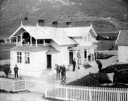 Fyrste huset vart bygt i 1887 og 1888. Branntakst vart halde 9. april 1888. Taksten vart på 6000 kr. Men huset fekk stå berre i 10 år, 27. april 1898 brann huset ned. Hovudbygning, depot, hestestall og uthus brann ned i løpet av 1 ½ time. Alt innbu og lausøyre som var assurert for 12000 kr, strauk og med. Det var oberstløytnant Solem som då budde i huset.
