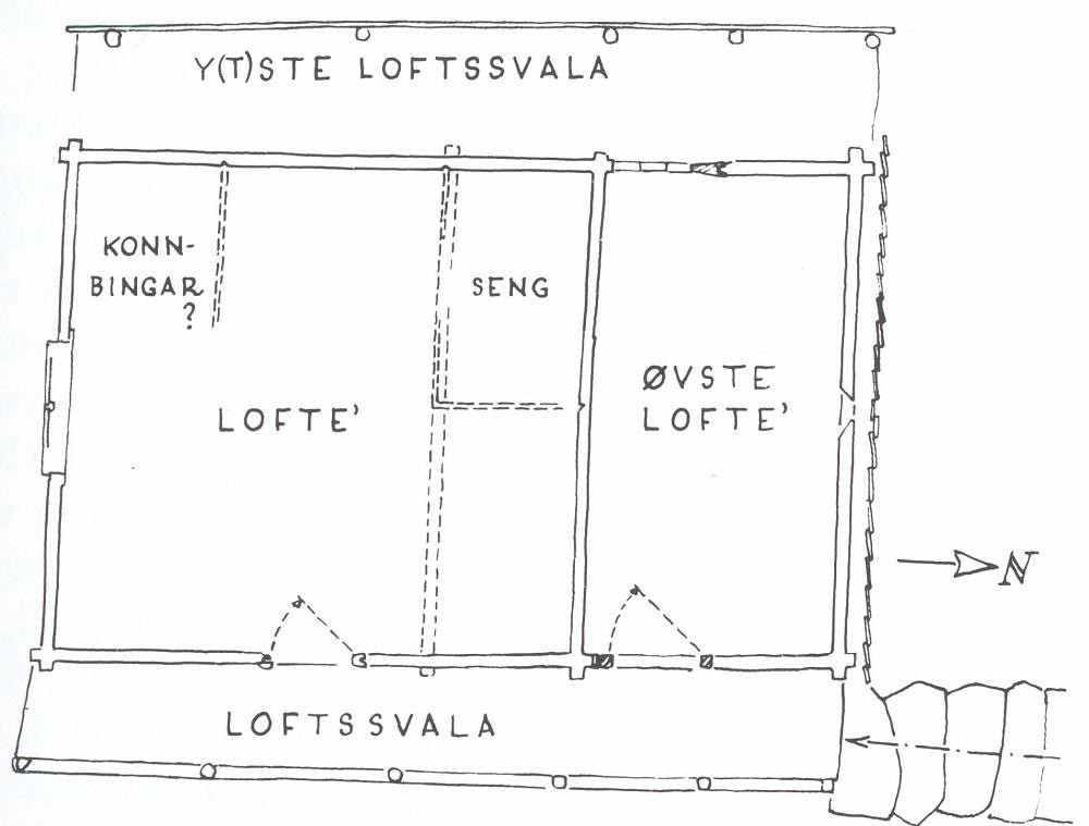 Huset har svalgang på sidene, og står på høge, mura pilarar. Ein av pilarane er ein einaste stein. Det er trapp i eine enden. Etter det Arne Berg skriv, er det underleg at denne bygningen vert kalla loft, ettersom byggjemåten ikkje minner om hus som til vanleg er rekna for loft. Dei er i to høgder, medan dette huset er i ei høgd, og har to rom etter einannan, begge med dør i langveggen. Det største rommet er kalla loftet, og det minste vesleloftet. Berg trur nemninga loft på dette huset kan ha tre forklaringar. Den første er at loftet opphavleg var del av eit tradisjonelt loft. Den andre forklaringa kan vere at huset har hatt funksjon som eit loft. Den tredje forklaringa er at huset står på høge fundament, slik at huset kjem uvanleg høgt over bakken.