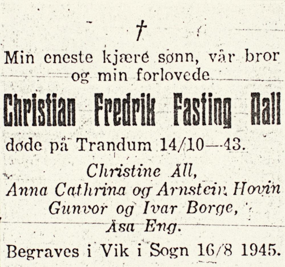 "AALL, CHRISTIAN FREDRIK FASTING, handelsagent, Fana. Født 21. mai 1914 i Vik i Sogn, s. av Nicolay Benjamin Aall, f. 1883, og Christine f. Aarseth, f. 1886. Handelsgymnas. Flyktet høsten 1941 fra Ålesund til England og gikk inn i Kompani Linge. Ble våren 1942 sendt til Norge i særoppdrag, og slo seg ned på en sæter i nærheten av Nøttveit i Hordaland. Ble omringet og tatt til fange av tyskerne 30. mai 1942 sammen med en kamerat. Satt i Bergens kretsfengsel, på Ulven og på Grini til han ble dømt til døden 13. oktober 1943 og skutt på Trandum dagen etter. Gravlagt i Vik."
