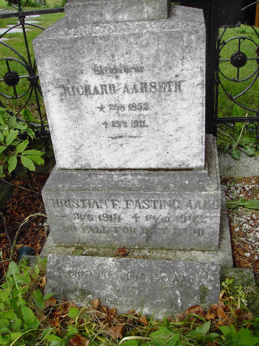 Christian Fredrik Fasting Aall vart gravlagd på familiegravstaden på nordsida av stavkyrkja. Namnet hans vart hogge inn på fotstykket på gravminnet over morfaren, skipsførar Richard Aarseth (1852-1911). DU FALL FOR DITT LAND står det under namnet hans. Ved foten gravstøtta står ei steinplate med namnet på mora, Christine Johanna Aall, f. Aarseth, (teikn for fødd) (..) 1885 - (teikn for død) 27.11.1967