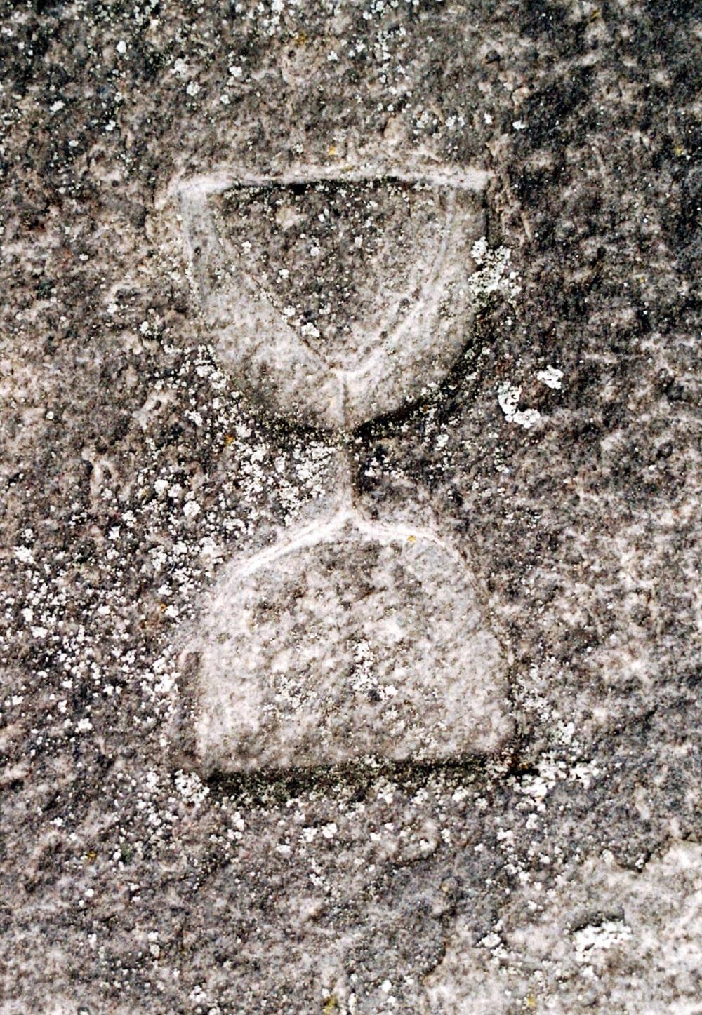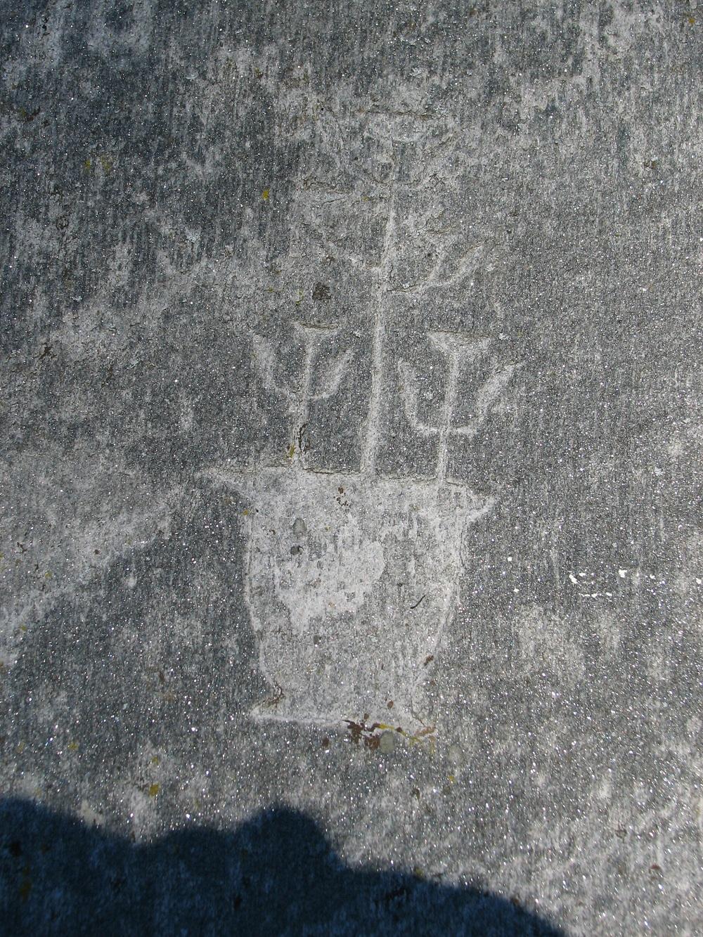 Det er nytta tre symbol: kross, blom og timeglas. Krossen står øvst og på kvar side står eit glas med blom, - i det eine glaset ein levande blom, i det andre ein blom som har mista livskrafta. Timeglaset heilt nede er eit symbol som har vore mykje nytta i gravsymbolikken, særleg på 1600- og 1700-talet, men og seinare. Det er eit teikn på at livet er som sanden i timeglaset. Det renn ut og ein skal vera førebudd på døden. Blomane er i seg sjølv eit teikn på liv og her eit symbol som høyrer saman både med krossen og med timeglaset: - blomen skal visna, som sanden renn ut av glaset, men krossen er teikn på frelse og æveleg liv. Mange gravmæle frå andre halvdel av 1800-talet er pryda med blomar.