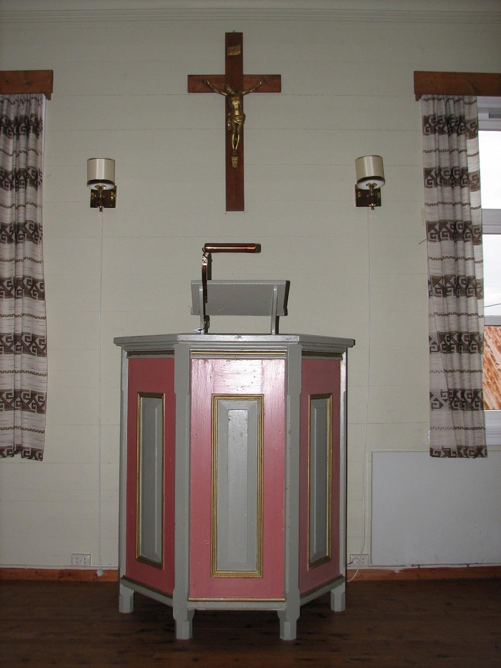 Inventaret er også samansett av gamalt og nytt. Den opphavlege talarstolen står midt framfor veggen mellom to vindauga. Han har ei sekskanta form og står på seks føter. "Dei har saga av føtene", fortel Per Marheim. "Dei var høgare før, - ja, omtrent slik" - han viser med hendene, ca 20 cm. Veggene er pryda med krusifiks av nyare dato over talarstolen, innramma bilete av Jesus som står framfor døra og bankar på, og eit bilete av ei kvinne frå Marifjøra (sjå lenger nede).