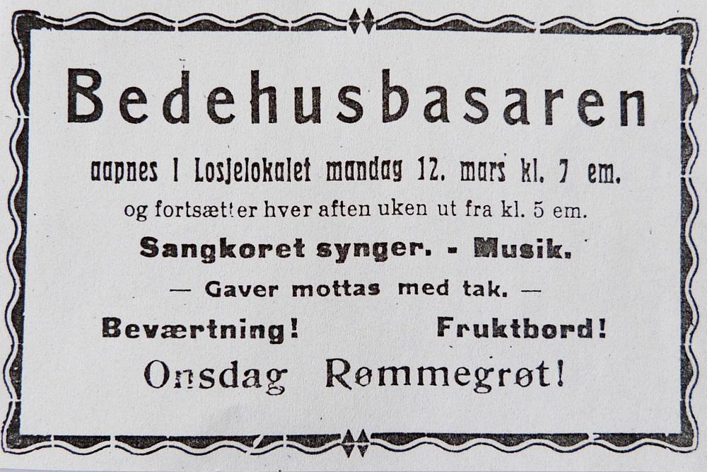 Ofring i kyrkja var ein måte å samla inn «midler» på, sameleis bedehusbasarar. I 1923 heldt dei to basarar, ein om våren og ein om hausten. Styret hadde stor annonse i Fjordenes Tidende 8. mars og omtale. Basaren byrja måndag kveld, den 12. mars, klokka 7, og heldt fram kvar kveld frå klokka 5. Onsdag stod «rømmegrøt» på programmet. Folk blei oppmoda om å møta fram og gjerne ha med gåver. «Kom og hjælp os enhver etter evne». Arbeidet med å byggja bedehus var no kome så langt at at det var utsikt til å få reiset huset «i løpet av sommeren».