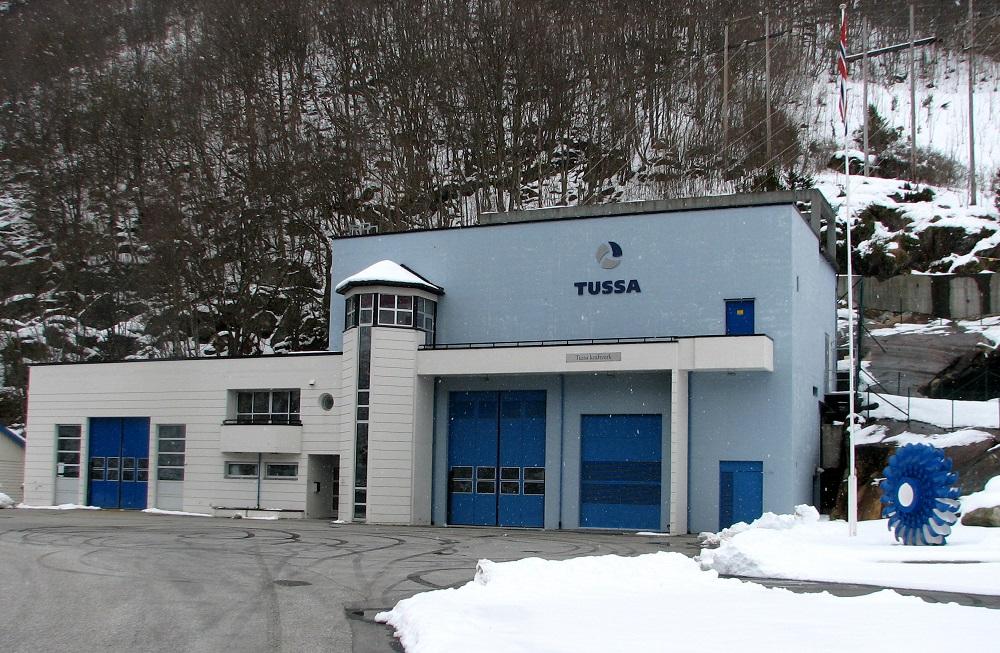 Inngangspartiet til Tussa Kraft sin kraftstasjon på Bjørke, inst i Storfjorden, Ørsta kommune. Minnesteinen står til høgre for turbinhjulet (utafor biletkanten).