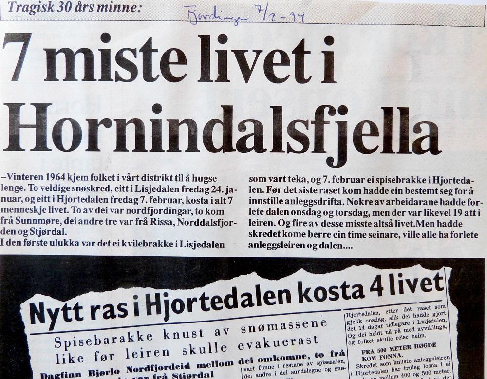 «Hjortedalen fredag 7. februar. Store snømengder gjorde at dei ville evakuere Hjortedalen på ny. Det meste av arbeidet var innstilt. Men arbeidarane hadde ikkje rukke å kome seg derifrå då Langeskredfonna frå Aksla ved 14.30-tida smadra to av Jernbeton [entreprenørfirmaet] sine bygningar. Fire mann mista livet: Kåre Bjørke, Stranda, Ole Saure, Bjørke på Sunnmøre, Arne Høiås, Stjørdal og Dagfinn Bjørlo, Nordfjordeid.»