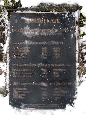 Minneplata med namn på dei 11 som omkom i Tussa-utbygginga 1958-194. (Biletet vart teke 4. april 2012. Det hadde snødd natta før slik at minneplata var dekka av eit 15 cm tjukt snølag.