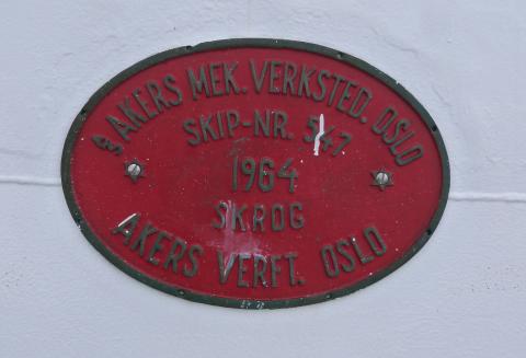 På byggnummer-plata står det: AS Akers Mek. Verksted. Oslo (-) Skip – nr. 547 (-) 1964 (-) Skrog (-) Akers Verft. Oslo.