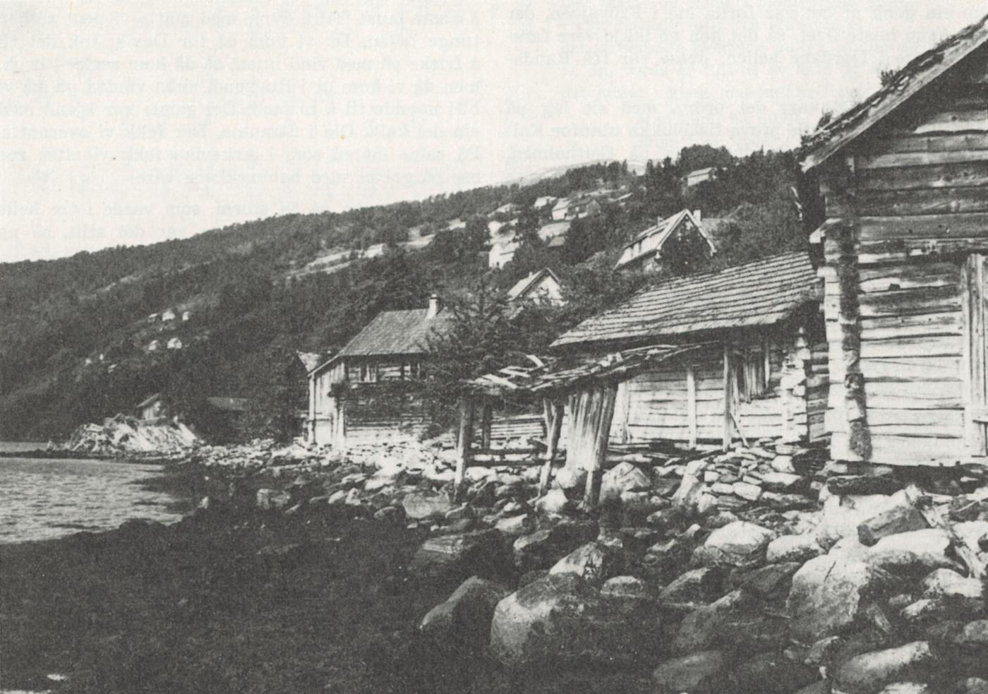View of the area at Geitholmen seen from Hovdenakken the way it looked about 1930. The islet of Geitholmen is located to the extreme left in the picture. There we can see the shack called Utvikstova and the foundation walls of Ulvestadstova. On the islet of Meholmen, in the centre of the picture, we find the foundation walls of Heggdalsstova. Tistambua is the building we see on the small islet, and it was torn down in 1937. To the extreme right was Randastova.