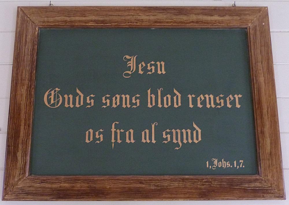 Bedehuset er utsmykka med fleire broderte arbeid. Det innramma bibeleordet frå 1. Johannes brev, kapittel 1, vers 7, er plassert midt over podiet.