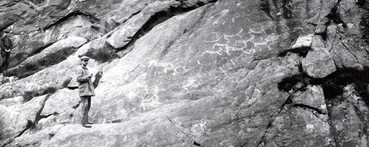 Det er mange hjortedyr i Vingen, ofte med intrikat kroppsdekor som vi heller ikke er helt sikre på hva betydde. Bergkunsten ble tidligere malt opp, det er ikke lenger lovlig. Foto: Trond Lødøen, Universitetsmuseet i Bergen