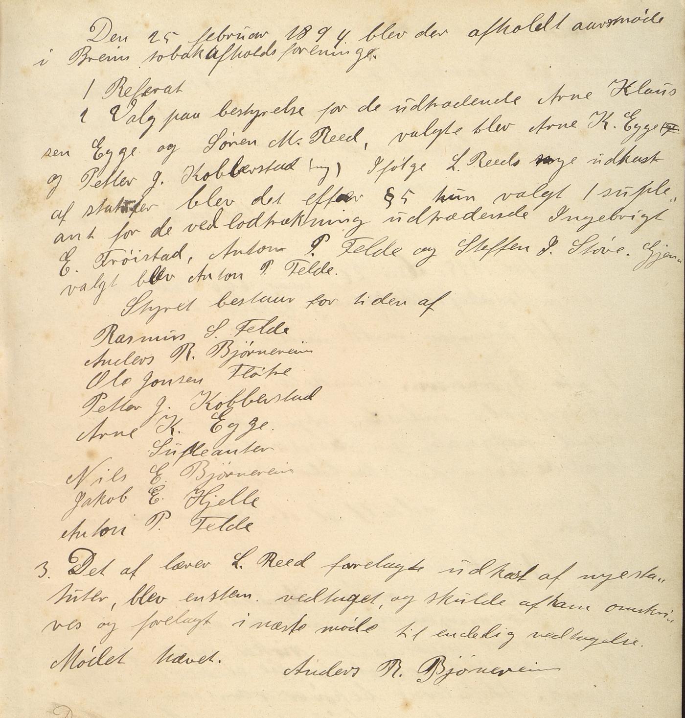 Fremover begyndelsen af året 1883 kom efter fælles overlegning en del af Bredheims unggutter sammen i skolehuset på Bjørnerem for at diskutere forskillige af tidenes spørgsmål. Blandt de forskillige spørgsmål, som her blev behandledes, var også spørgsmålet om, hvad der måtte gjøres, for at den opvoksende ungdom kunde føre et mere sparsomt liv. Under behandlingen af dette emne strejfedes også ind på tobaksbrugen. Tobakken blev stemplet som en artikkel, der ikke allene var økonomisk ruinerende, men som også havde skadelige følger for både sundhed og renslighed. Tanken om opretelse af en tobaksafholdsforening blev da fremholdt.