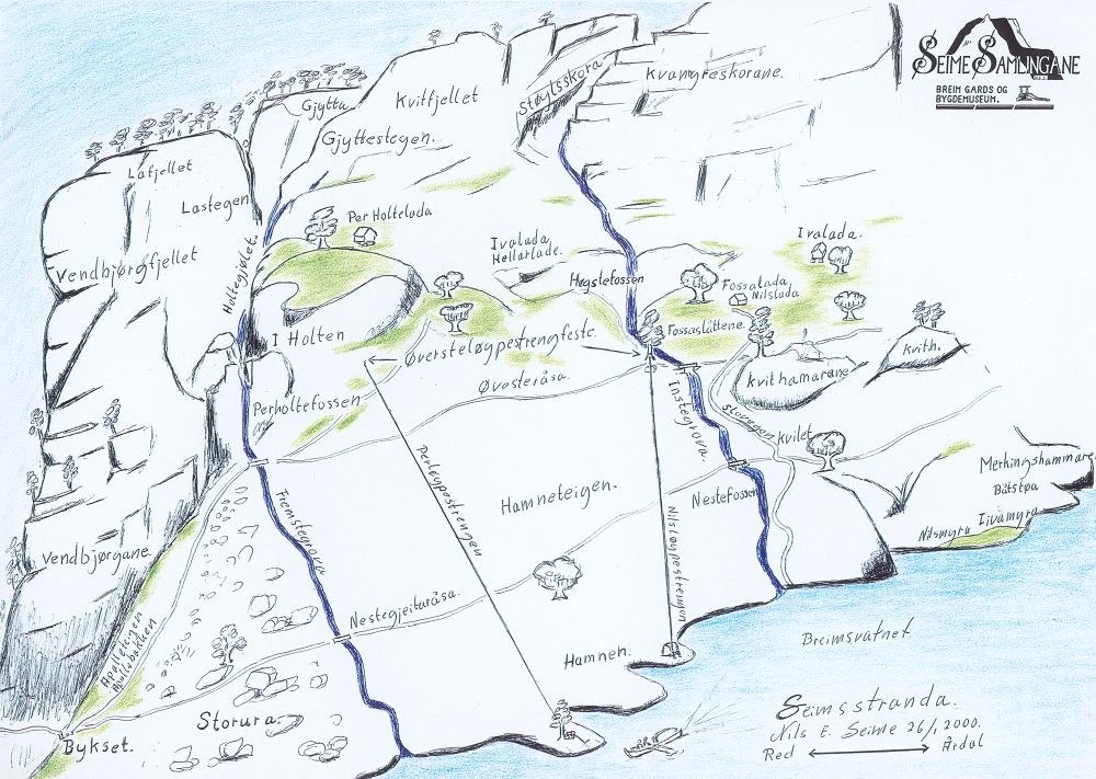 Seimsstranda er i dag mykje tilvaksen av skog, men kulturminna er likevel etter måten godt synlege. Mellom anna finn vi mange større og mindre styvingstre, eller "navar", som dei gjerna vart kalla i Breim. Almetrea er truleg mellom 150 og 300 år gamle.