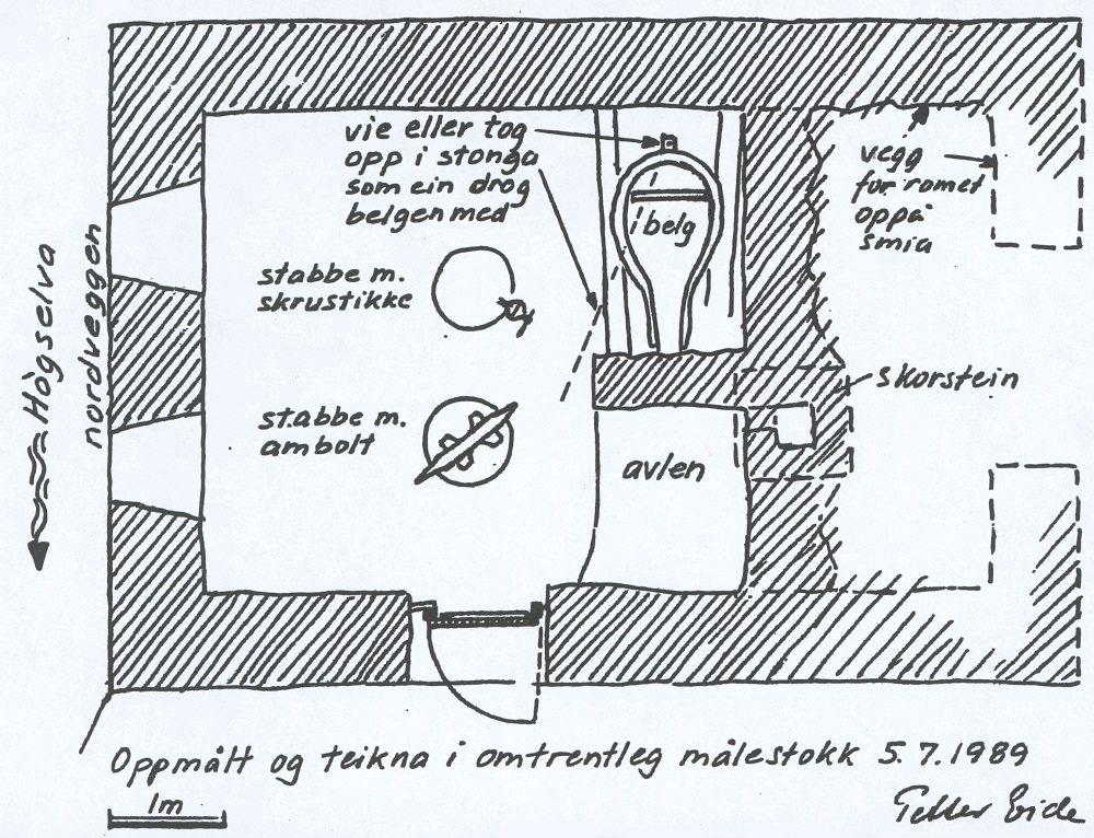 Ei tredør i vestveggen fører inn til sjølve smia. I døropningen er muren om lag 0,85 meter tjukk. Til høgre, rett inn for døra, er avlen plassert. Ein kan stå framfor avlen og dra belgen med stonga som er opphengd i taket. Skulle smeden ha sterkare lufttrekk, la han ein stein oppå belgen, slik at han gjekk fortare ned att. Lyset i rommet kjem inn gjennom to symmetrisk plasserte gluggar i nordveggen.