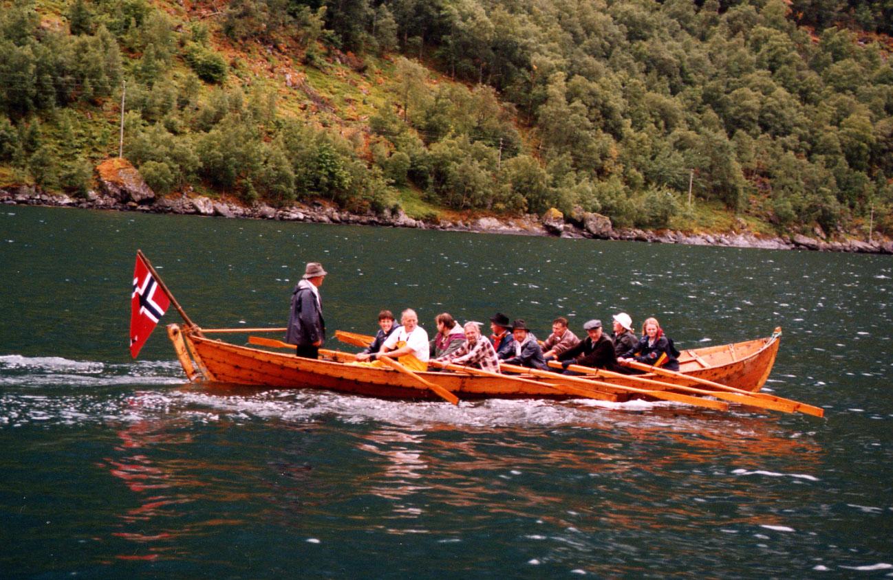 Frå kulturminnestafetten i 1997. Lotskyrkjen - også kalla Veslekyrkjen - i godt sig utover Nordfjorden. Med godt mannskap og jamn roing kan ein fort legge nokre sjømil bak seg i ein slik båt.