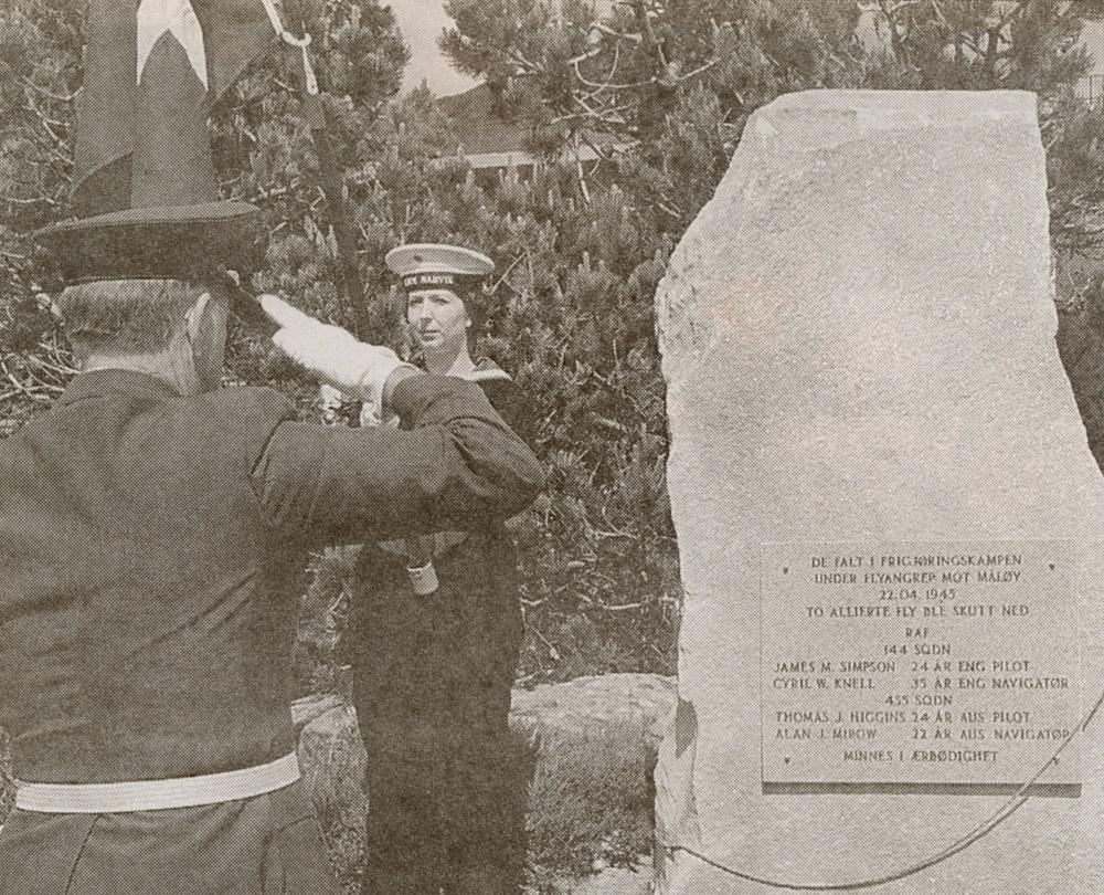 DE FALT I FRIGJØRINGSKAMPEN * UNDER FLYANGREP MOT MÅLØY * 22.04.1945 * TO ALLIERTE FLY BLE SKUTT NED * RAF * 144 SQDN * JAMES M. SIMPSON 24 ÅR ENG. PILOT * CYRIL W. KNELL 35 ÅR ENG. NAVIGATØR * 455 SQDN * THOMAS J. HIGGINS 24 ÅR AUS. PILOT * ALAN J. MIROW 22 ÅR AUS. NAVIGATØR * MINNES I ÆRBØDIGHET