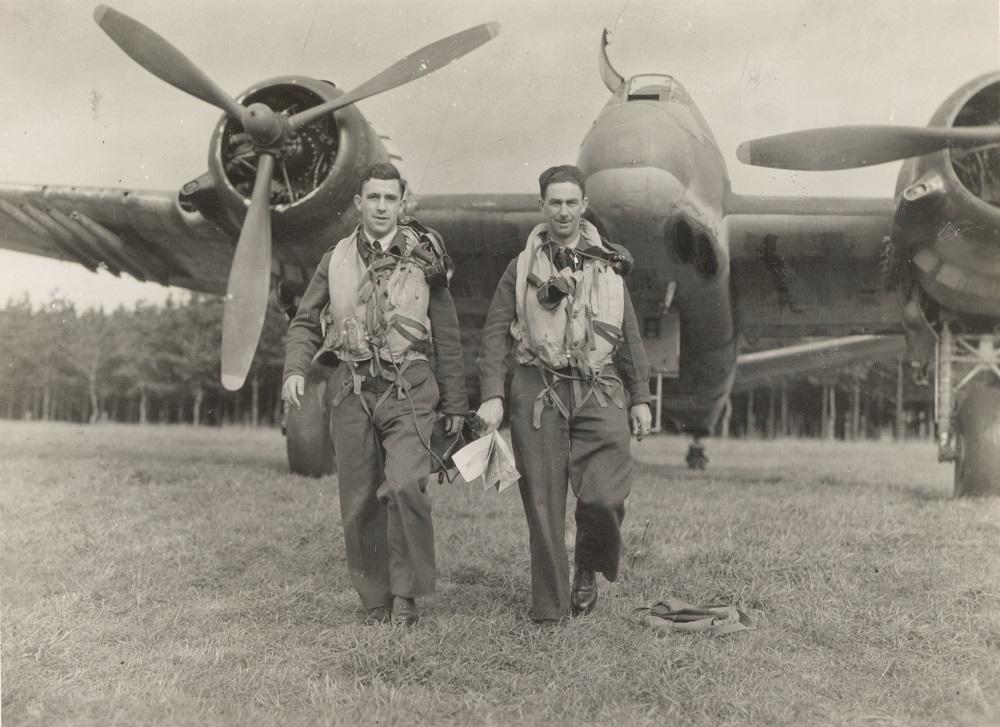 Two airmen from New Zealand in front of a Beaufighter, the same type of plane that was shot down during the air raid on Måløy on 24 April 1945. These two airmen were shot down at Silda on 6 December 1944, and survived an emergency landing on the sea.