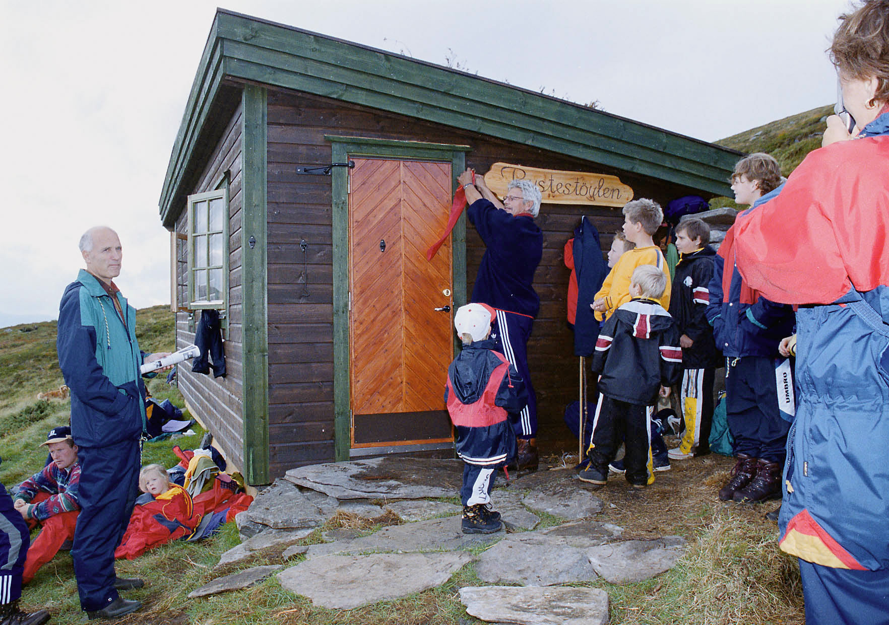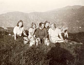 A welcome break for the milkmaids from Raudeberg. At most there were up to 10 milkmaids at Rystestøylen. From left to right: Svanhild Olsen Televik, Solbjørg Vedvik Hals, Johanne Sandvik, Ester Holmen Låstad and Magda Fagerlid Gotteberg.