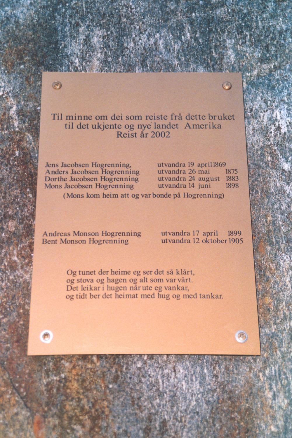 Garden Hogrenning ligg på nordsida av Lovatnet, kring fem km inn frå vassenden. Minnesteinen om dei som reiste til Amerika frå bruk nr. 2 i åra 1869-1905 står i gardstunet. Han står i ein bakke mellom vegen og gardsplassen, og er 160 cm høg og kring 100 x 70 cm nede. På framsida er festa ei tekstplate 29,5 x 42 cm. Jens Hogrenning, bonde på garden 2002, fann steinen nede ved vatnet.