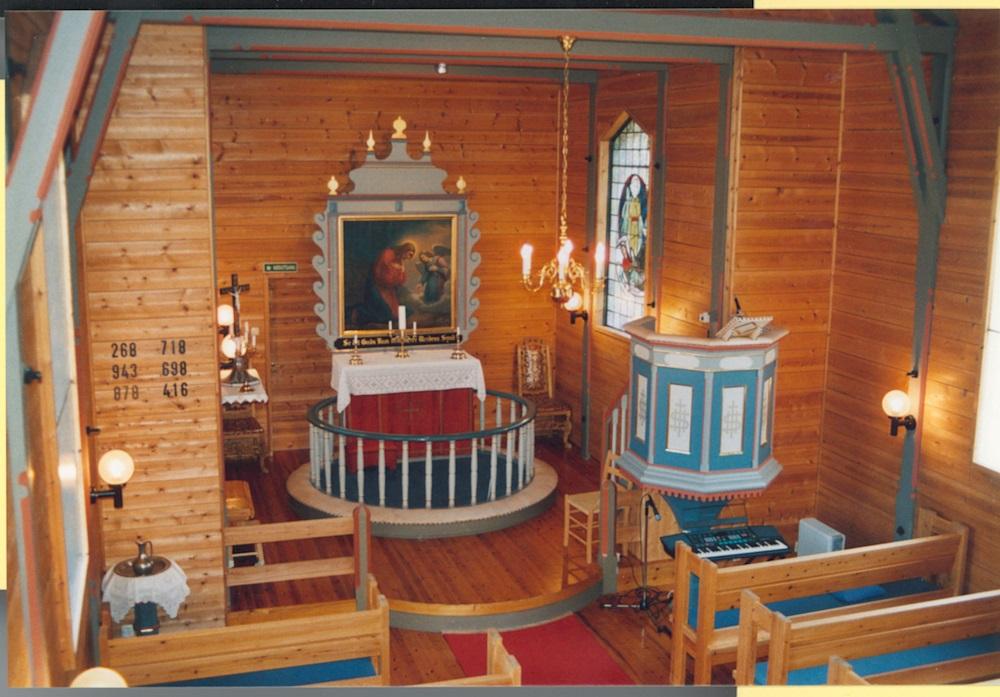 I samband med restaureringa til 100-årsjubileet i 1970 vart kyrkja ein god del endra. Dei grå og lys brune kyrkjebenkene vart skifta ut med nye, der vart lagt ståande panel på veggene, som erstatta det tidlegare liggjande, gråmåla panelet. Dei tre spissboga vindauga på kvar side av skipet vart innvendig dekka til med isolasjonsglas som er heile og ru i utforminga. Løysinga er noko spesiell, for det hindrar utsyn frå kyrkjerommet. Eit anna særmerkt innslag i kyrkjerommet er "utelampene" med blanke kuplar som er festa langs veggene. I det heile framstår kyrkja mykje meir enkel og på eit vis moderne innvendig enn det folk kanskje ventar seg når ein ser ho utanfrå.