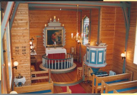 Frå 1870 var kyrkja innvendig stort sett umåla. Preikestolen hadde motiv som i dag og var måla med gul botn og elles brunt. Døypefonten var i kvitt og brunt. Kyrkja hadde alt då eit heller stort galleri med balustrade som i alterringen. Måla til dei ulike romma i kyrkja var: skipet 10,9 x 6 m, koret 3,8 x 4,1 m, og våpenhuset 3,3 x 3,9 m. I tillegg har kyrkja eit sakristi som vart påbygt i forlenginga av koret rundt 1924.