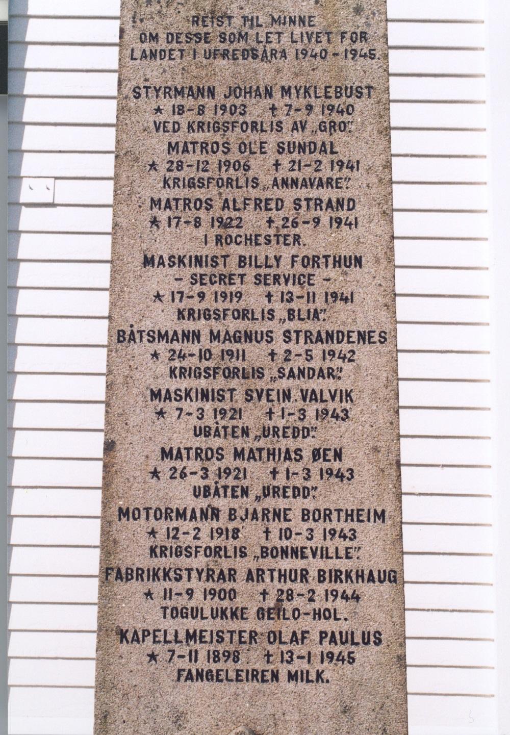 Teksten på minnesteinen, med namna på ti personar frå Fjaler som omkom under andre verdskrigen.