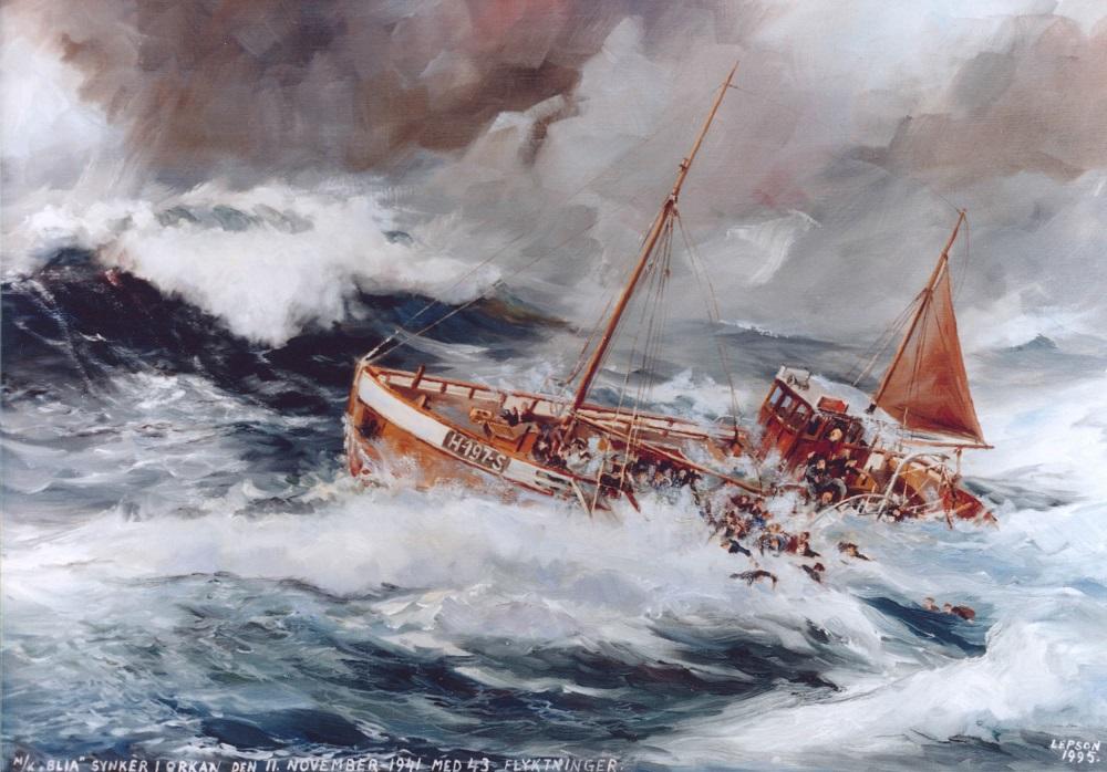 Blia-forliset i november 1941. Fotografi av målarstykke laga av Ants Lepson på grunnlag av innsamla data om båten av Trond Strandenes, nevø av ein av dei omkomne.