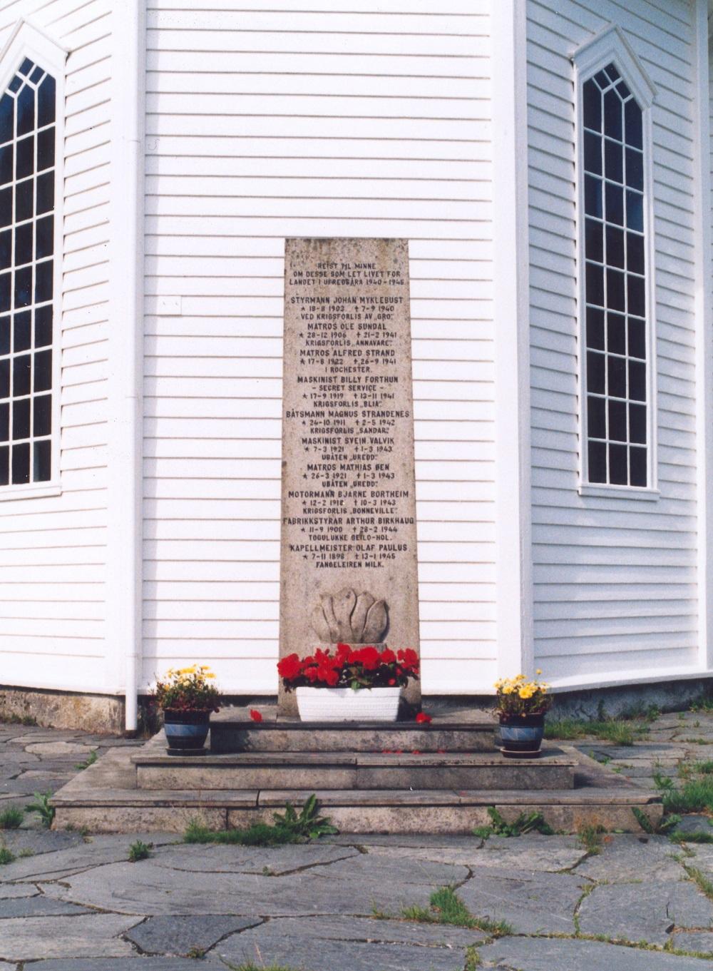 Minnesteinen over falne frå Fjaler står like innom hovudporten til kyrkja. Øvst står innhogge: