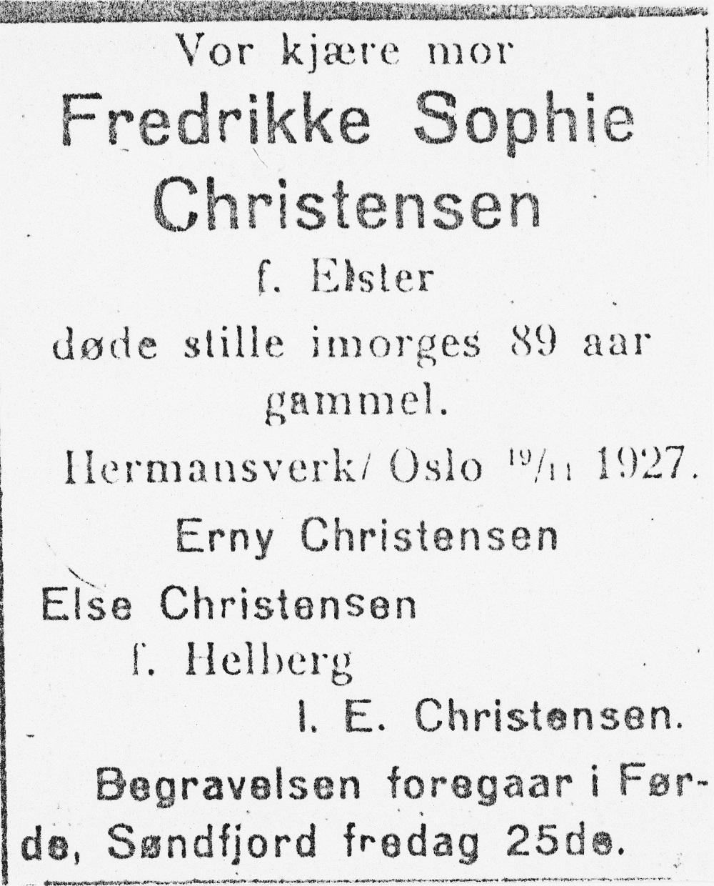 "Fru Fredrikke Sophie Christensen, født Elster er avgaat ved døden, 89 aar gammel. Avdøde var enke efter kaptein og amtsingeniør Michael Christensen og mor til statsraad [og fylkesmann] I.E. Christensen og avdøde forfatter Hjalmar Christensen samt frk. Erny Christensen. Digteren Kristian Elster var hendes bror. Fru Christensen har i mange aar været det samlende midtpunkt paa den gamle slegtsgaard Skeid i Førde, Sunnfjord."